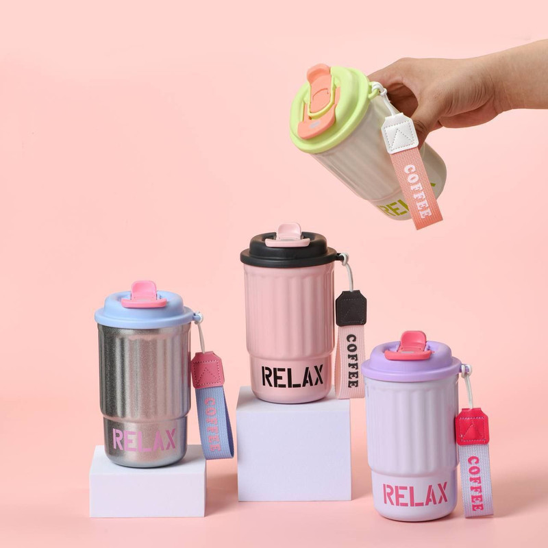 تراول ماگ ریلکس ساخته شده از استیل دوجداره ۳۱۶ یکی از تراول ماگ های فانتزی جدید در بازار می باشد. این تراول ماگ دو حالته بوده و دارای لبه ی آسان نوش و نی دار می باشد. کف این محصول از سیلیکون استفاده شده تا بر روی میز سر نخورد. این محصول در حجم ۴۰۰ تا ۵۰۰ میلی لیتر جزو ماگ های سفری با حجم مناسب و مخصوص سفر های شهری می باشد. یک بند جذاب پارچه ای همراه این محصول می باشد که حمل آن را ساده تر کرده است.